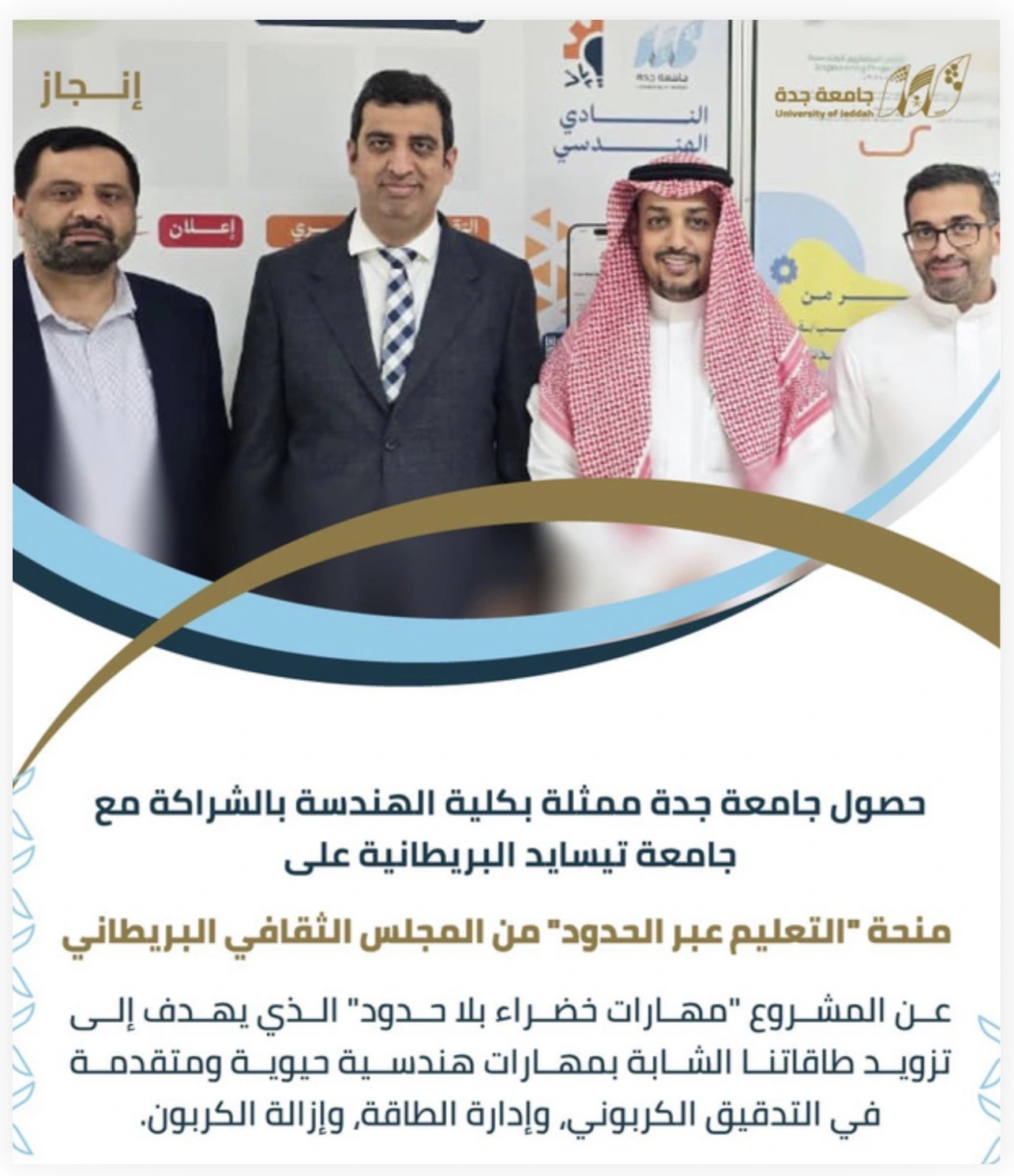 حصول جامعة جدة ممثلة بكلية الهندسة بالشراكة مع جامعة تيسايد البريطانية على منحة "التعليم عبر الحدود" من المجلس الثقافي البريطاني عن المشروع المشترك :